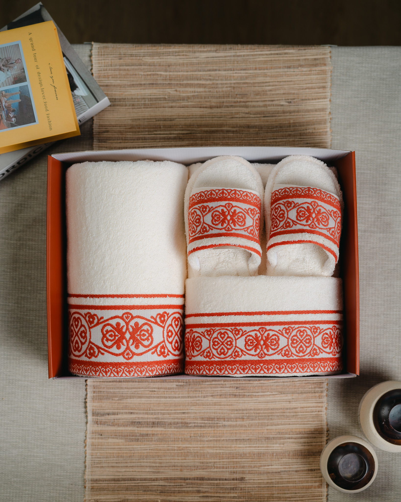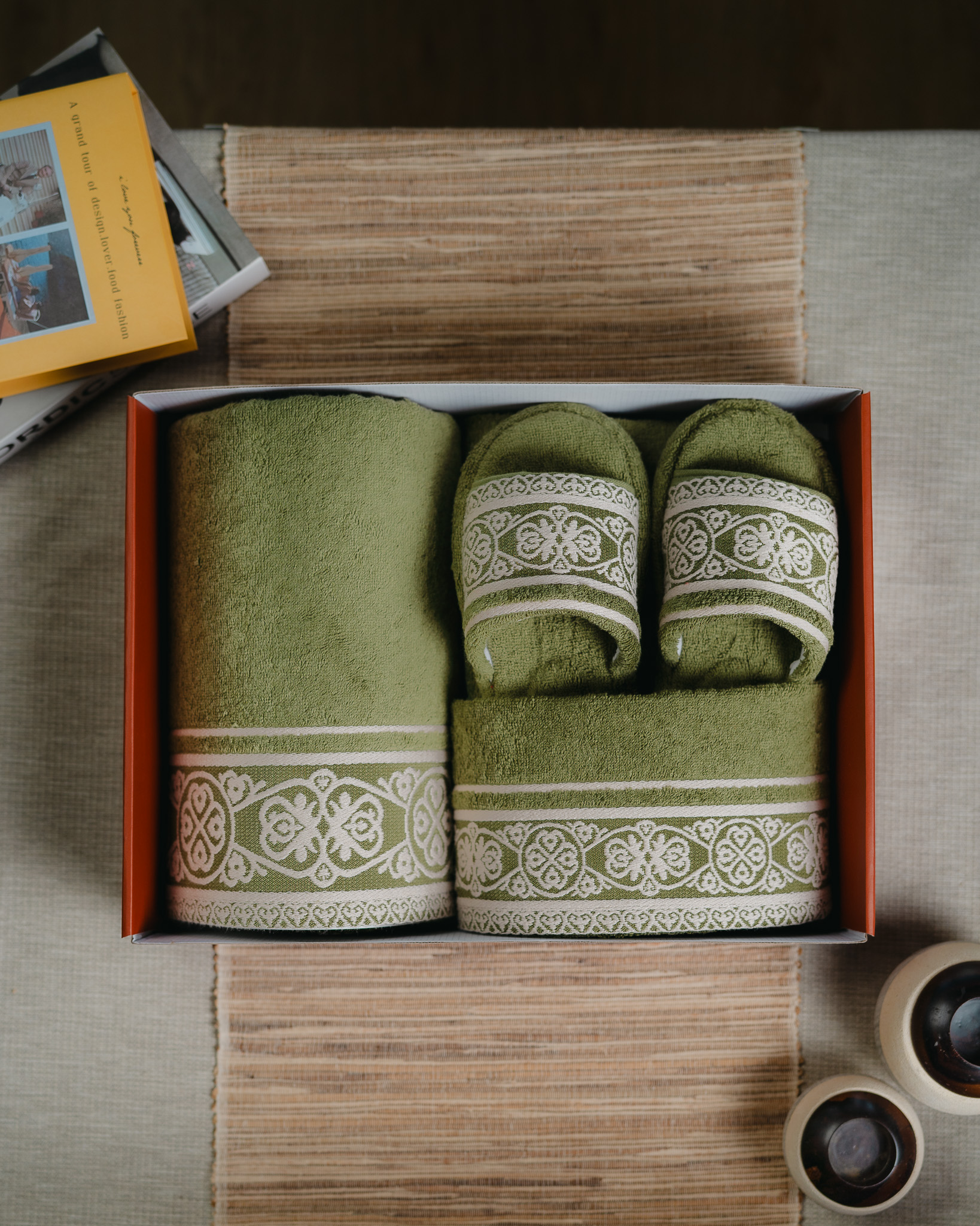 Set ini berisi Carment Bath Towel, Carment Sport Towel, Face Towel, serta Slipper, seluruhnya dipilih untuk memberikan kenyamanan maksimal dalam aktivitas sehari-hari. Dibuat dari 100% cotton premium dengan tekstur lembut, tebal, dan daya serap tinggi, diperkaya detail classic geometric border khas Carment yang timeless.