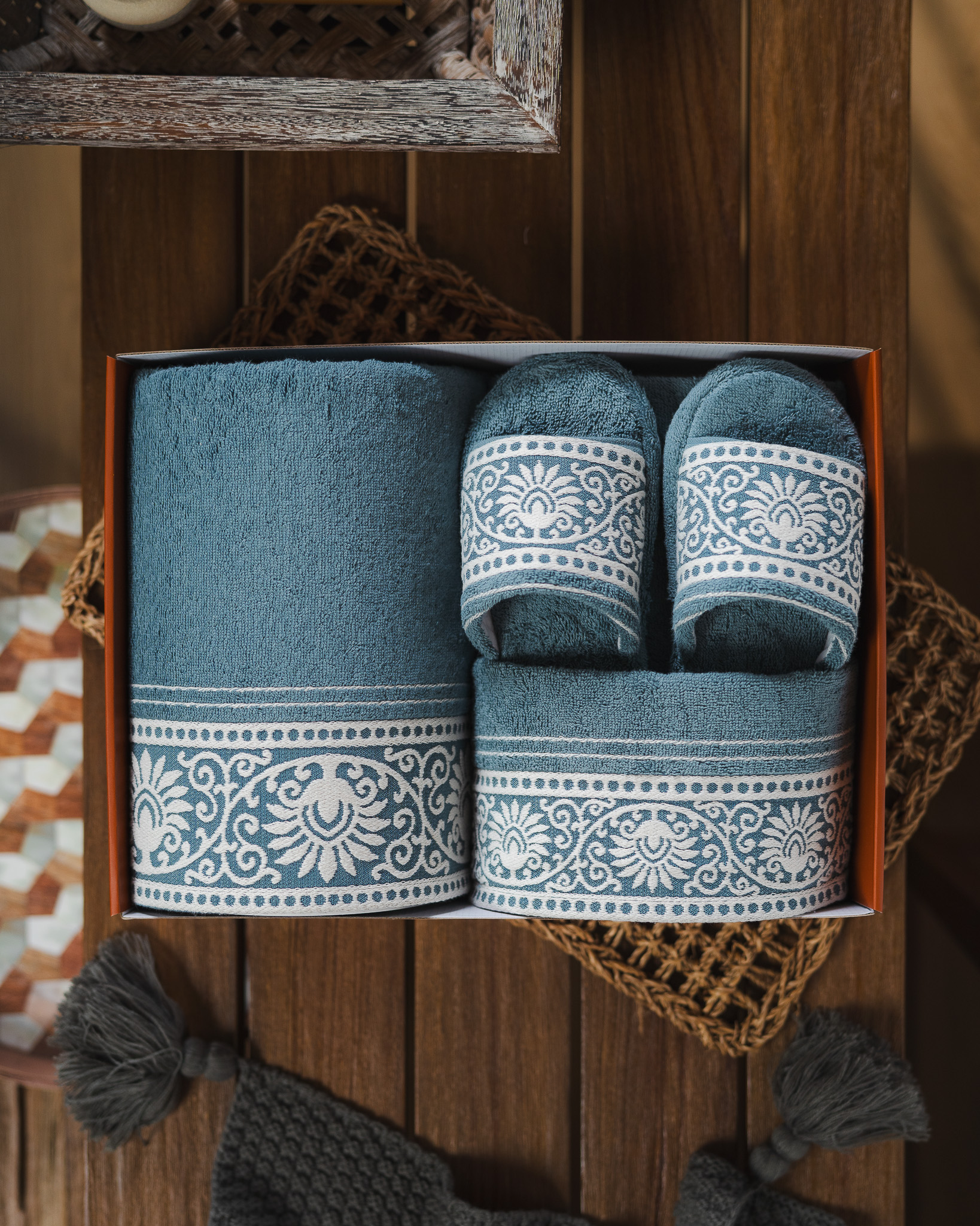 Set ini berisi 4 item esensial , 1 Bath Towel, 1 Sport Towel, 1 Face Towel, dan 1 pasang Home Slipper, semuanya dibuat dari bahan lembut yang nyaman dipakai sehari-hari. Motif floral khas Inara membawa kesan feminin, klasik yang indah, sementara pilihan warna Blue, Grey, dan Green memberikan nuansa tenang yang memikat.
