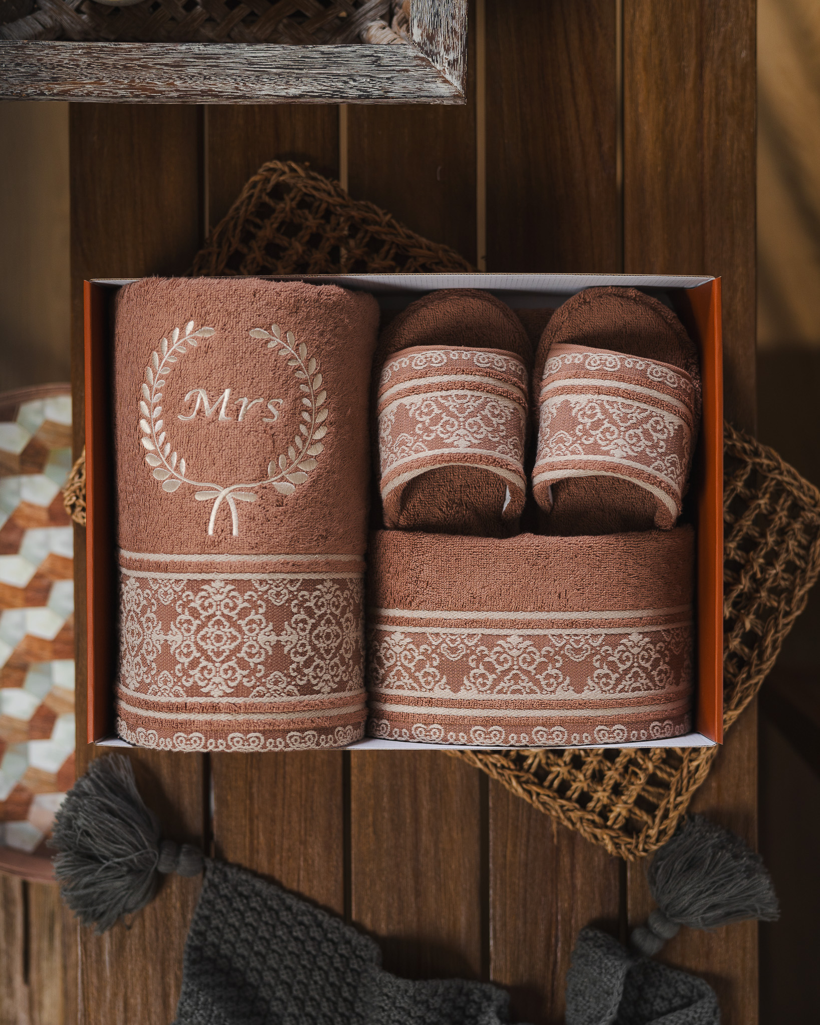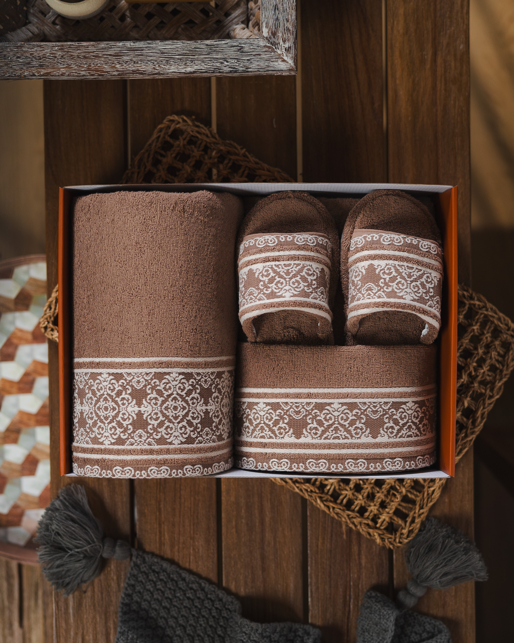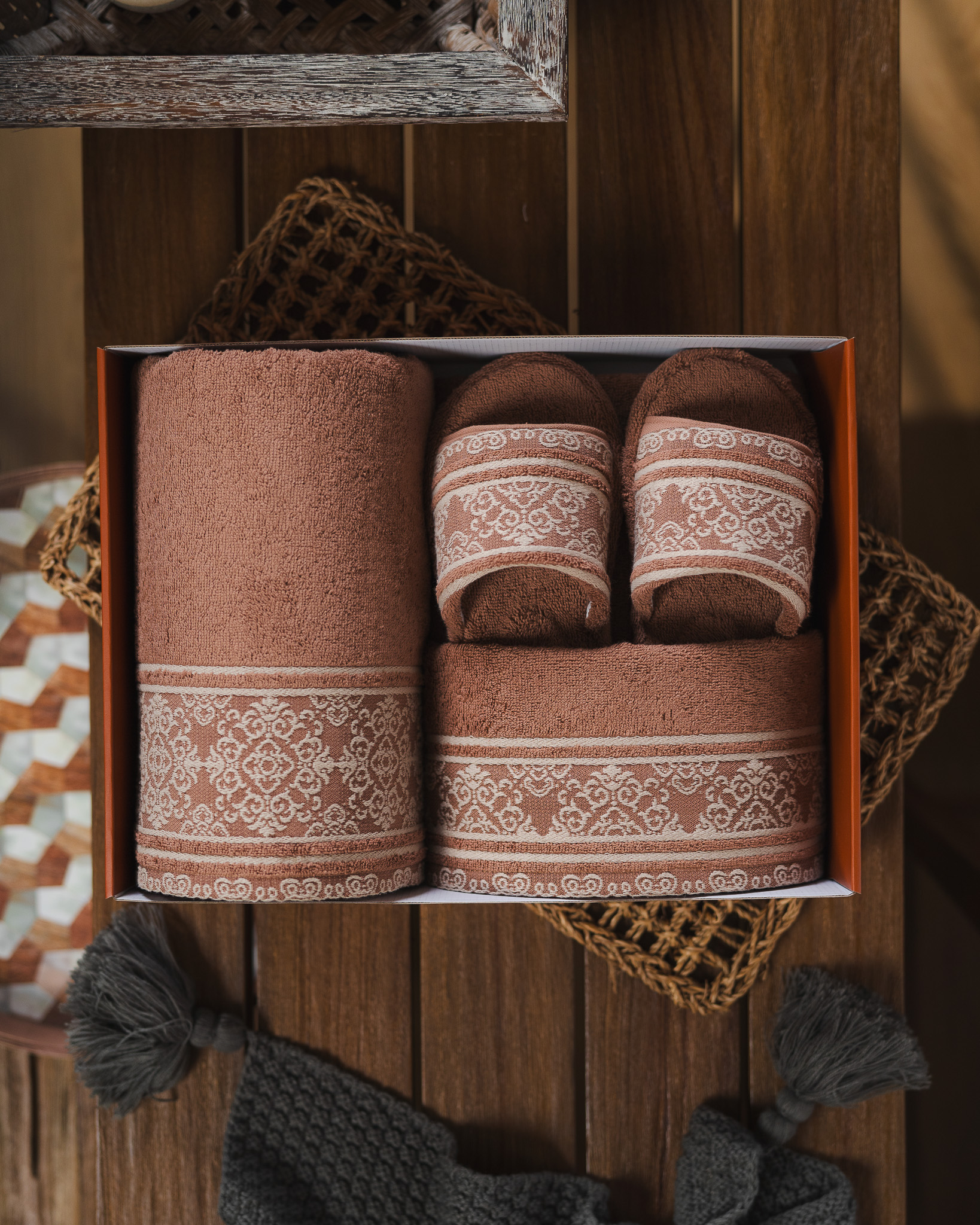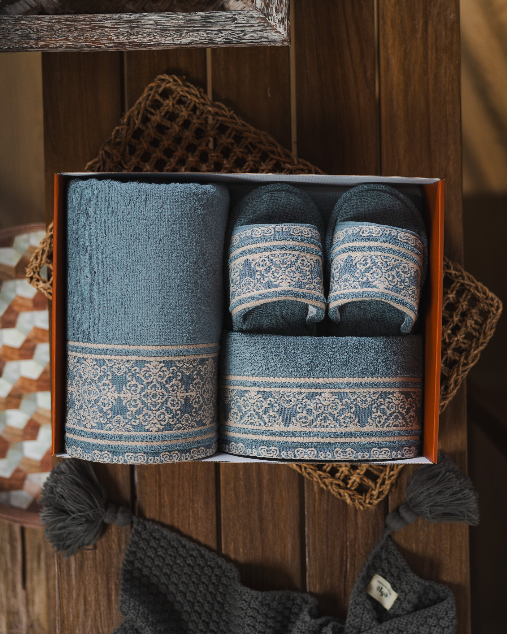 Di dalamnya terdapat 1 Bath Towel, 1 Sport Towel, 1 Face Towel, dan 1 pasang Home Slipper, seluruhnya dibuat dari material lembut dengan daya serap tinggi. Motif woven geometrik khas Zeya memberikan sentuhan karakter yang berkelas, detail klasik yang tetap tampil modern dan rapi.