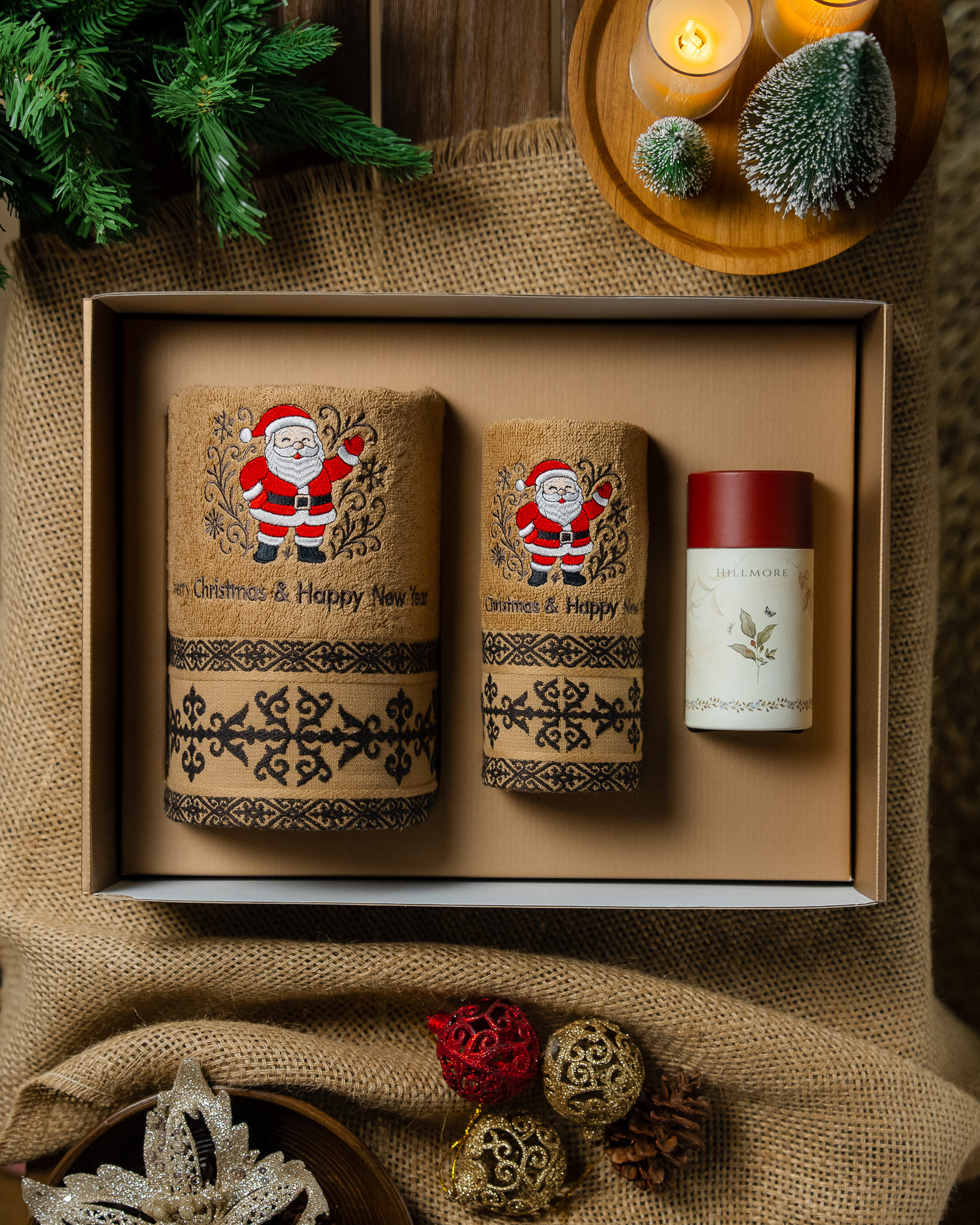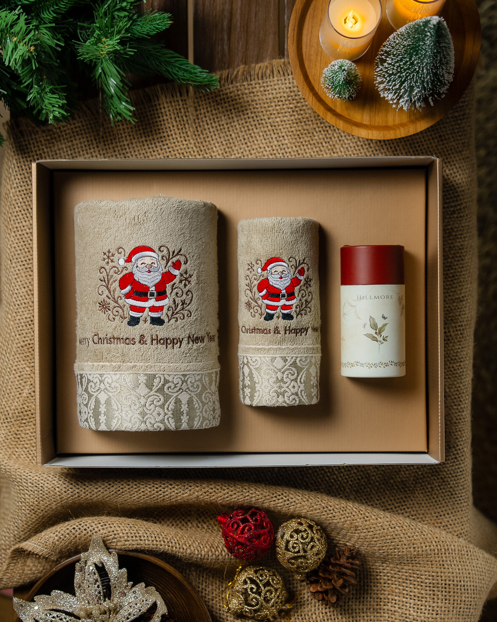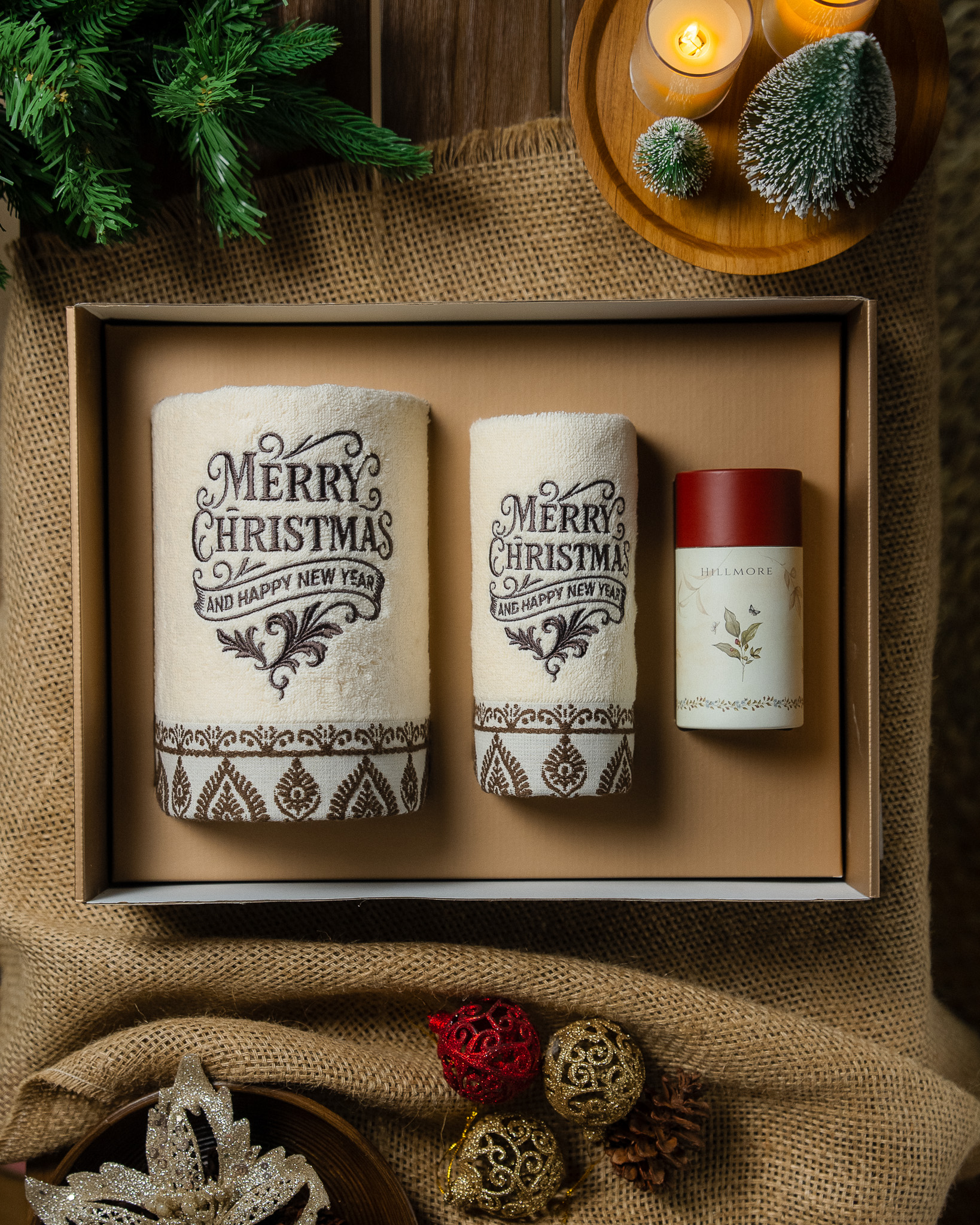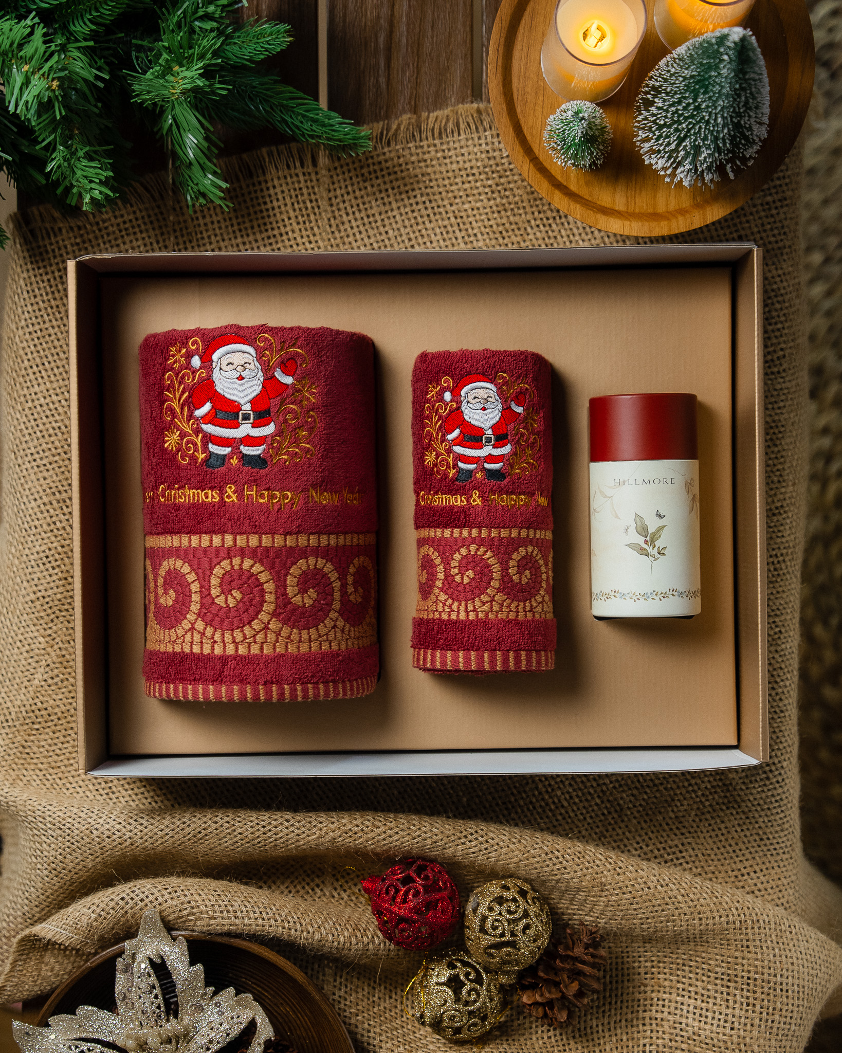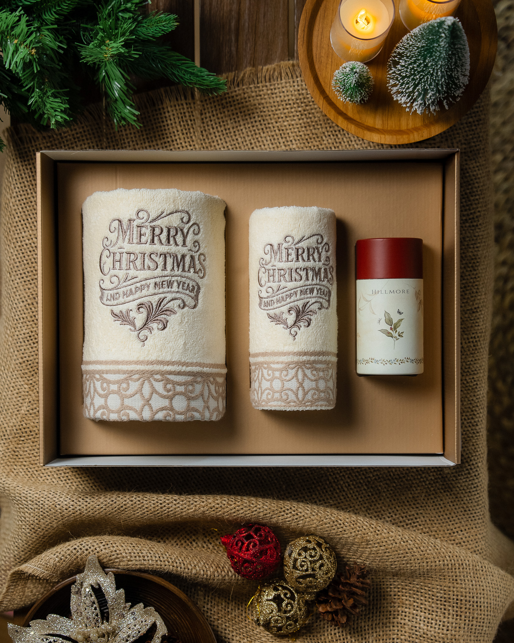 Each set features one premium bath towel, one sport towel, and homemade almond cookies, all beautifully arranged to create the perfect balance of comfort and delight. Crafted from soft, high-quality cotton, the towels offer a luxurious feel and lasting usefulness, while the freshly baked cookies add a heartfelt touch to the festive celebration.