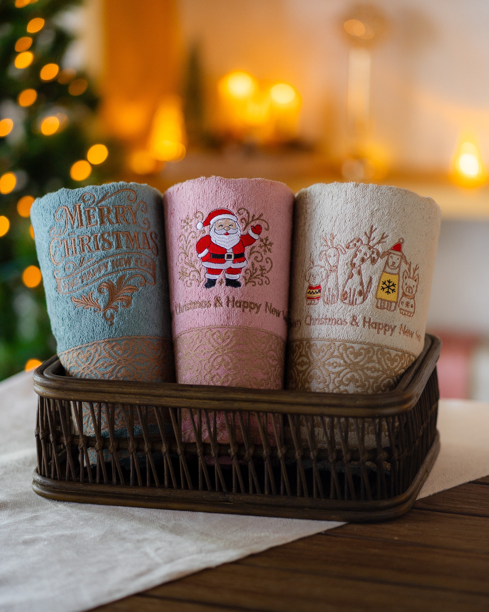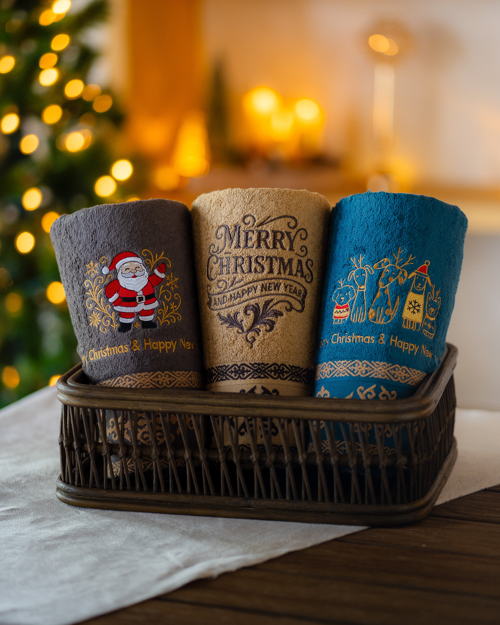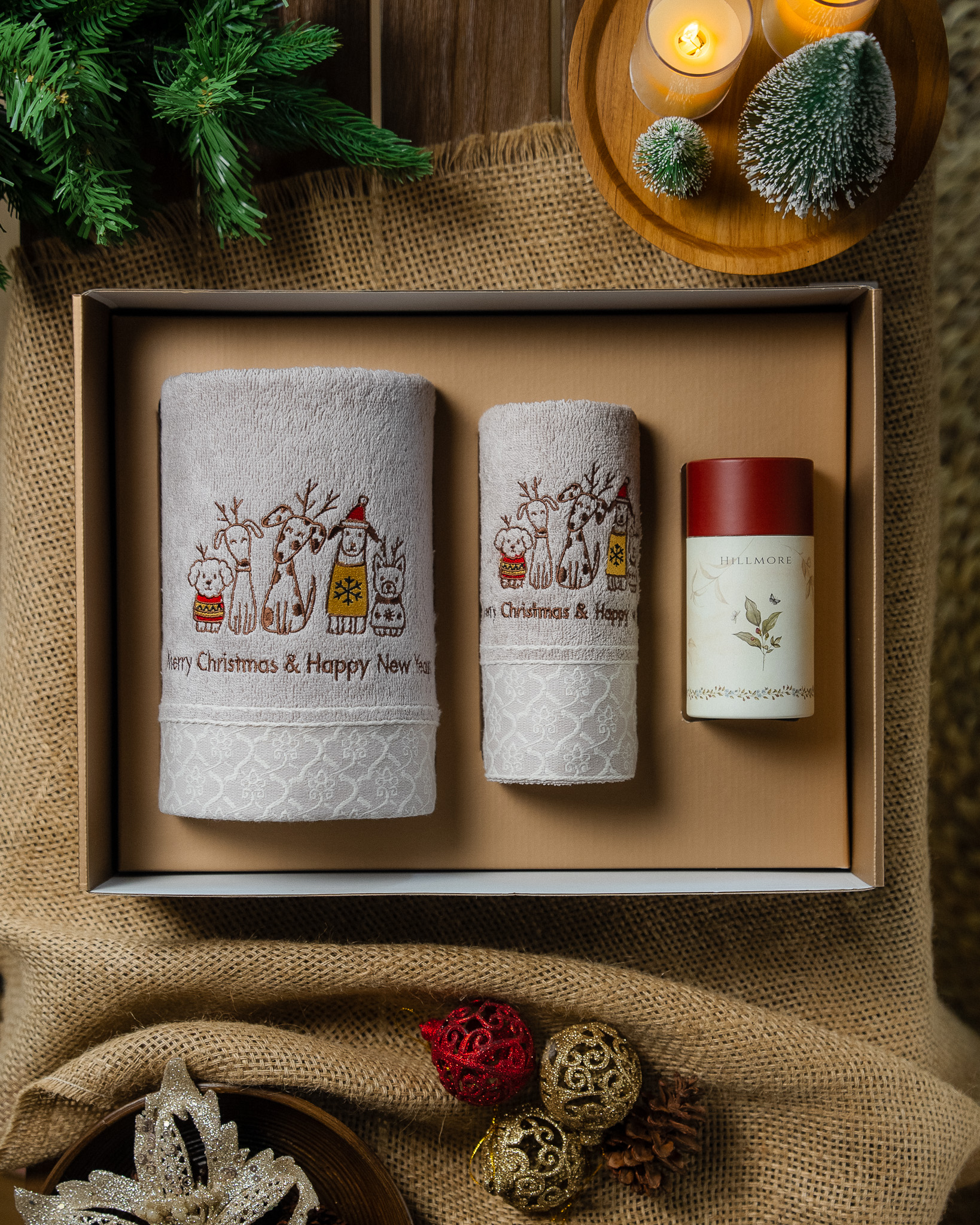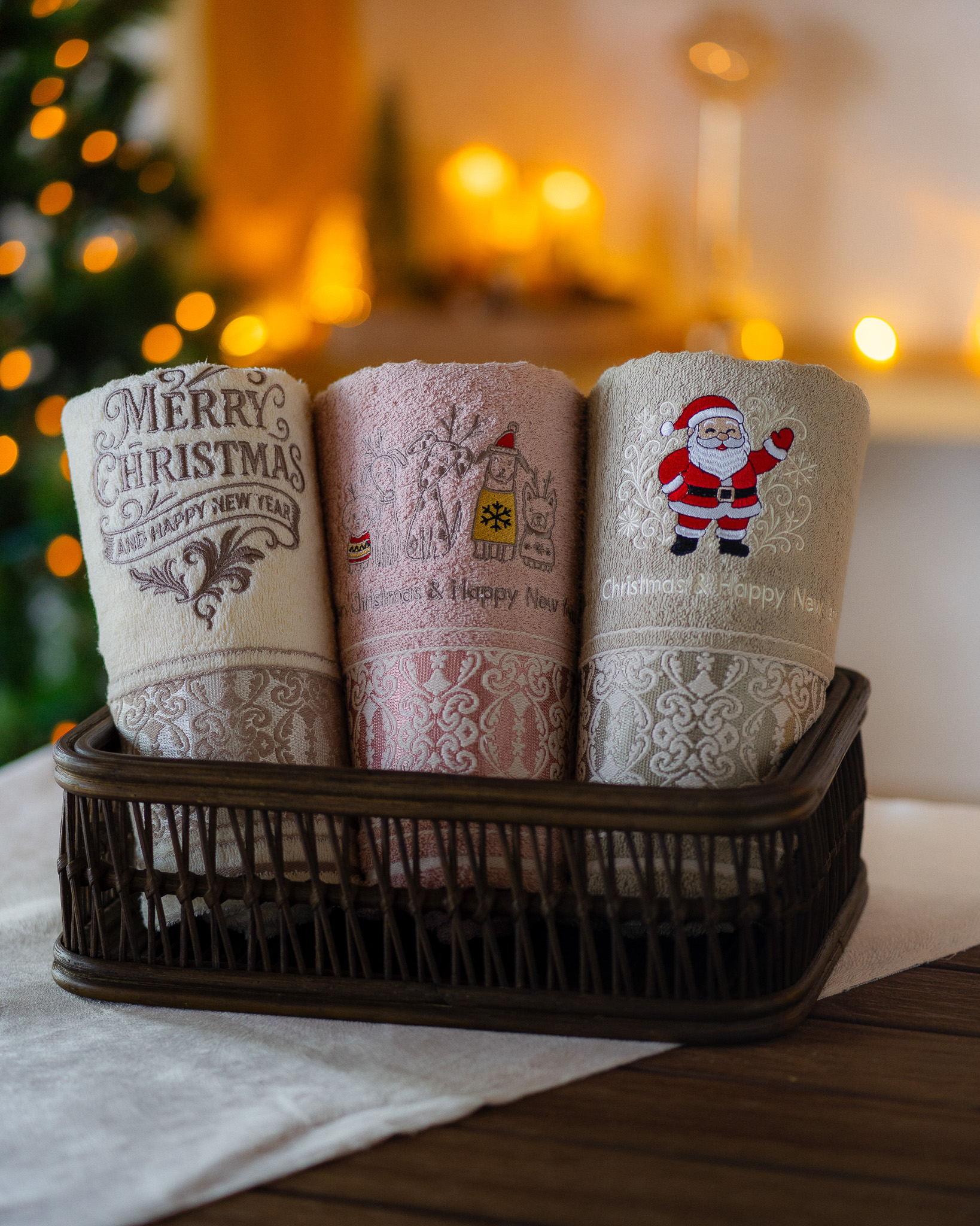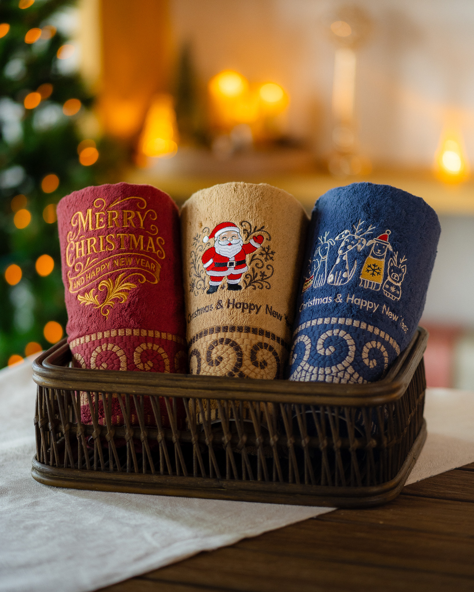 Each set features one premium bath towel, one sport towel, and homemade almond cookies, all beautifully arranged to create the perfect balance of comfort and delight. Crafted from soft, high-quality cotton, the towels offer a luxurious feel and lasting usefulness, while the freshly baked cookies add a heartfelt touch to the festive celebration.