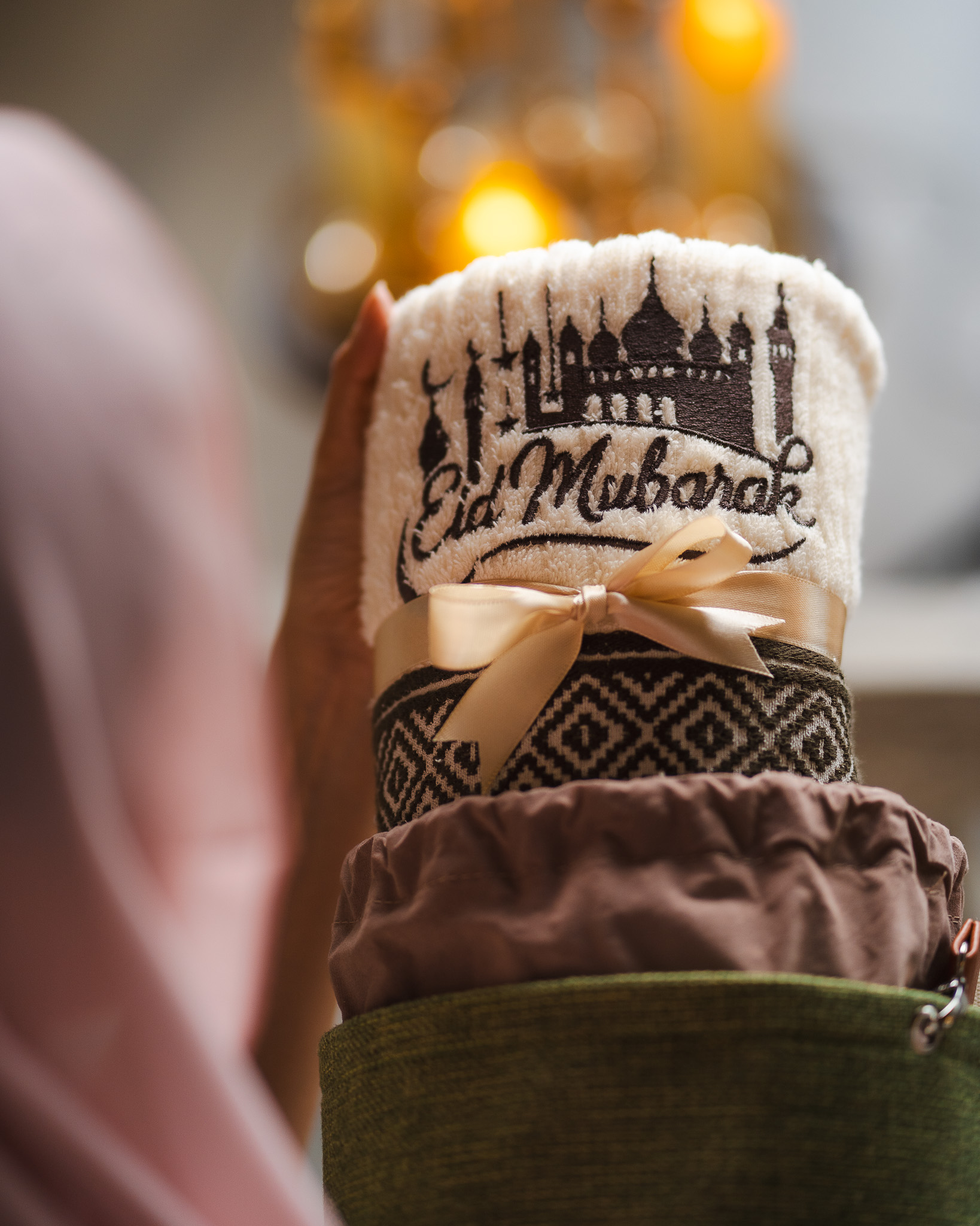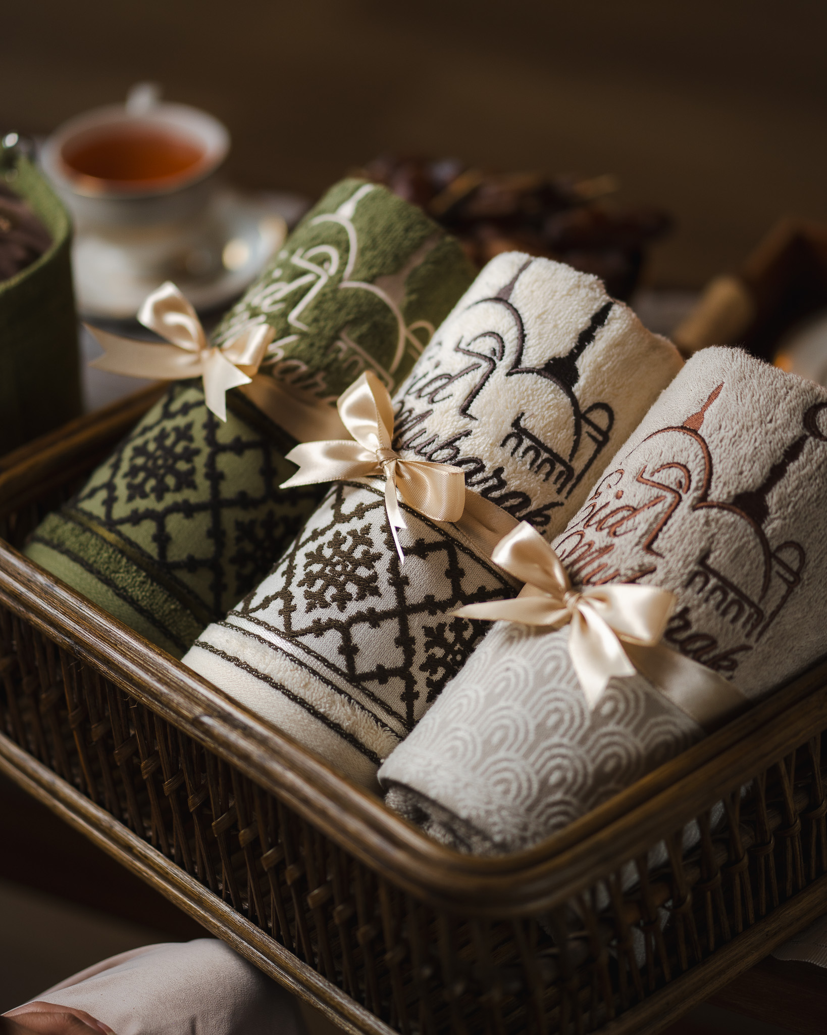 Featuring a premium bath towel adorned with beautiful Eid Mubarak embroidery, this gift is presented in an exclusive mini bucket bag, thoughtfully paired with a matching greeting card. A stylish alternative to traditional hampers, ideal for personal gifting and practical festive gestures.