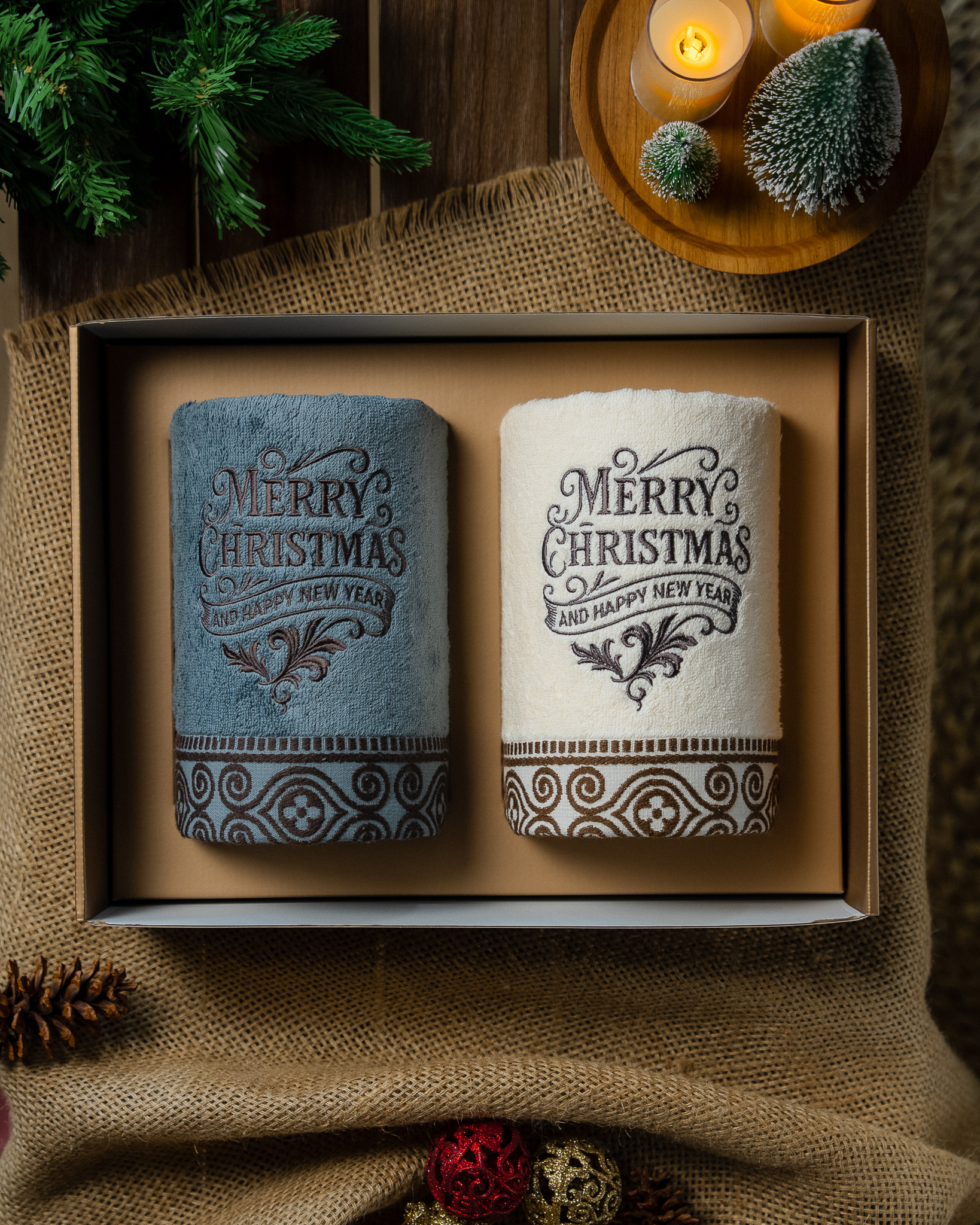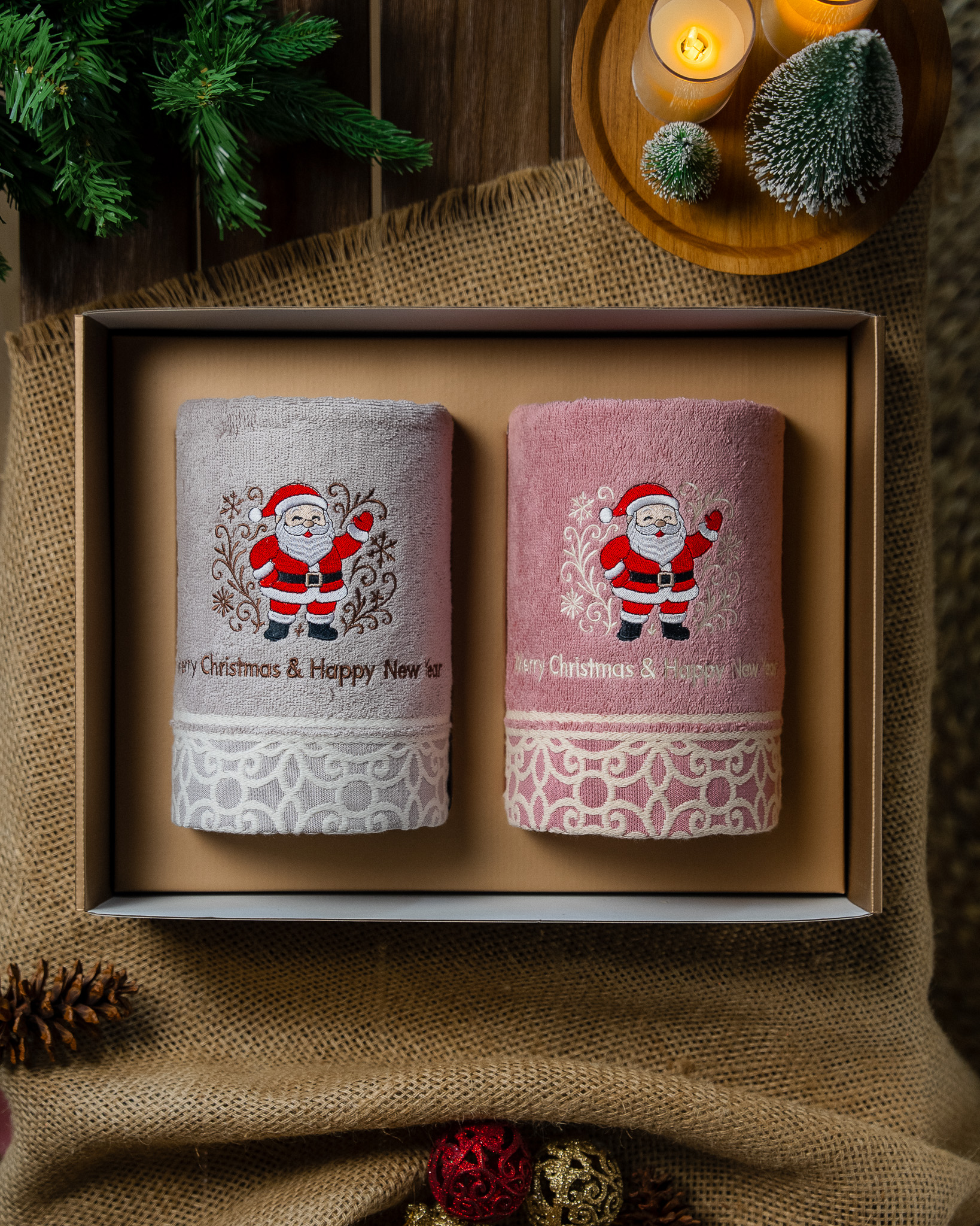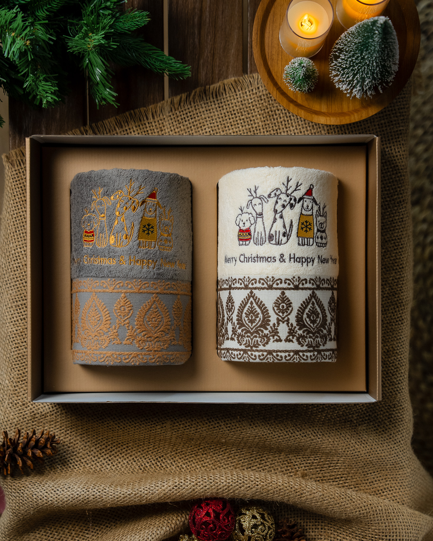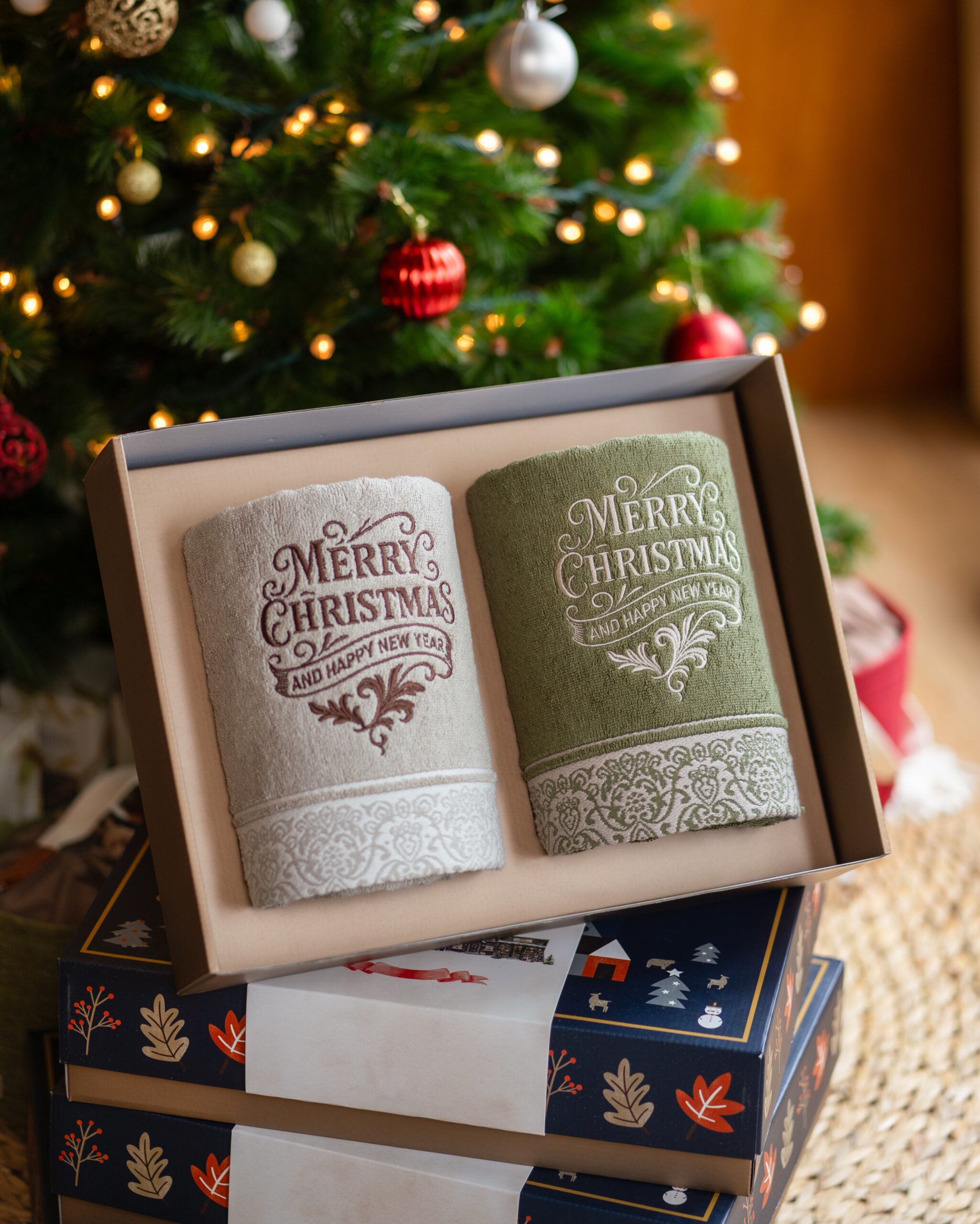 Each set includes two premium bath towels, crafted from high quality soft cotton for lasting comfort and absorbency. Every piece is adorned with exclusive Christmas embroidery and beautifully presented in a festive gift box complete with a matching greeting card.
