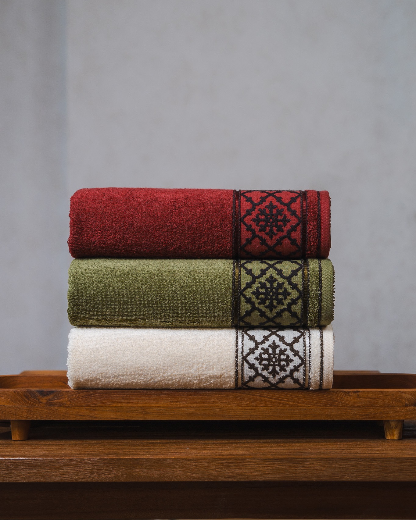 Detail border motif klasik yang tegas di setiap ujung handuk menambah kesan mewah dan timeless, menjadikannya pilihan sempurna untuk penggunaan pribadi maupun sebagai hadiah spesial di musim perayaan.