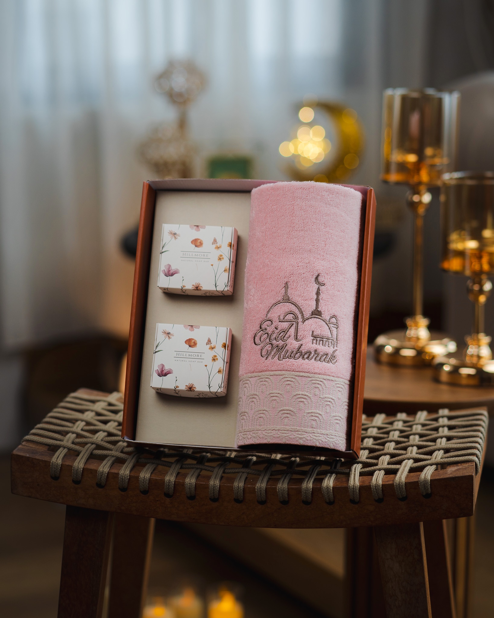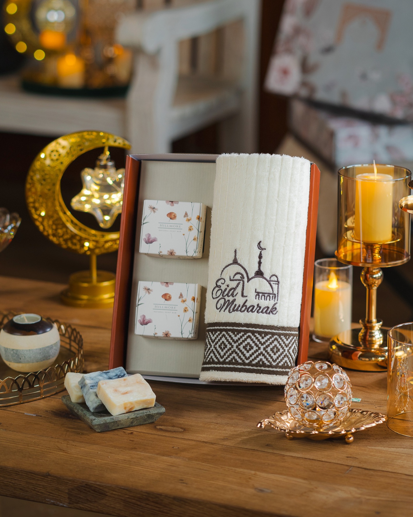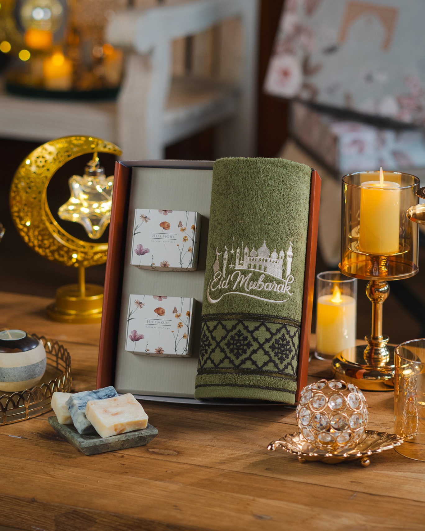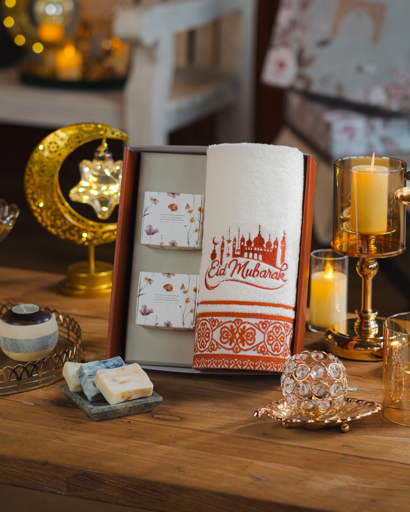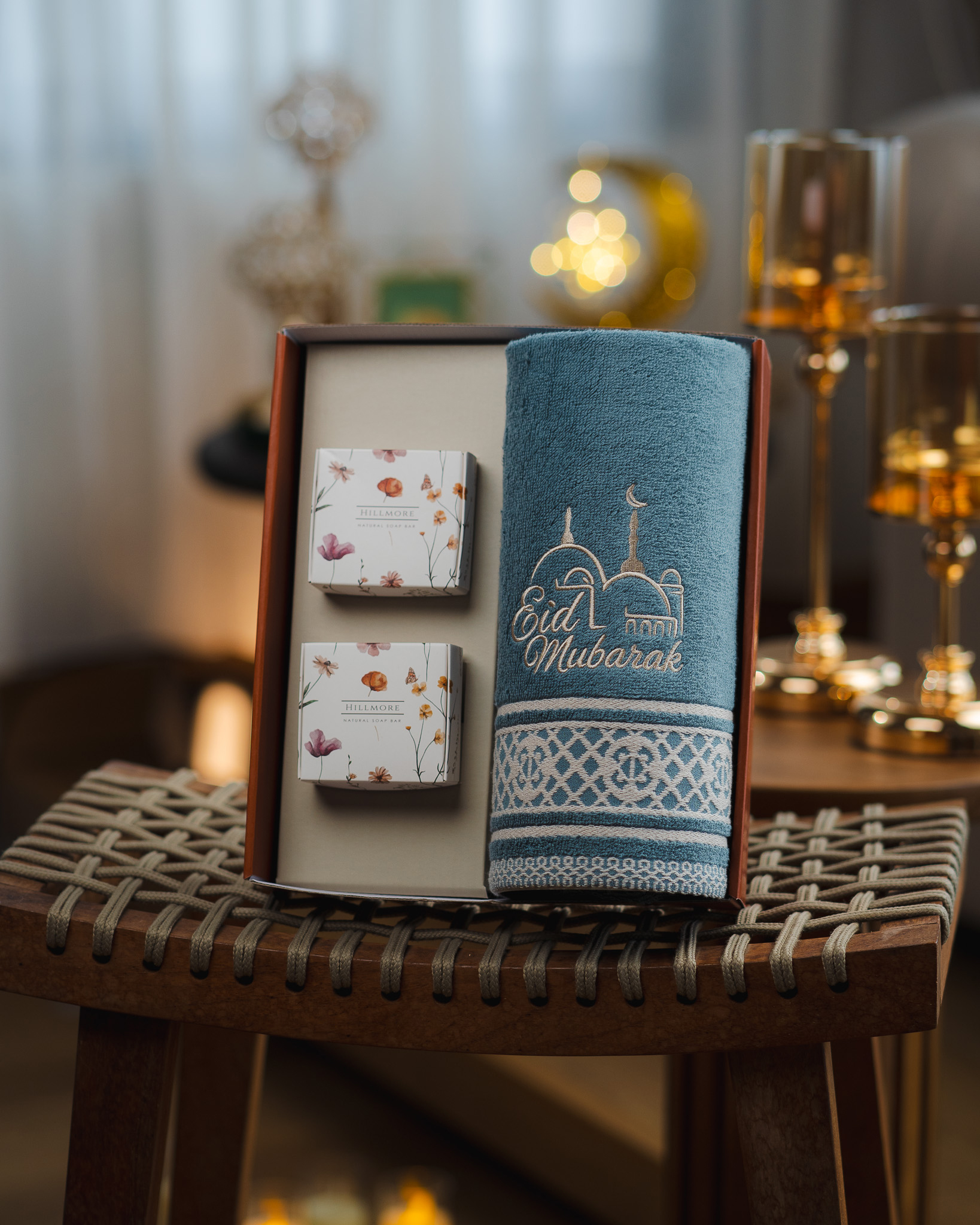 Featuring a premium sport towel adorned with beautiful Eid Mubarak embroidery, paired with Hillmore Natural Soaps crafted from turmeric teatree and charcoal, each element is chosen to promote comfort, freshness, and well-being. Presented in an exclusive Eid Mubarak gift box with a matching greeting card, Scientia is an ideal choice for refined personal gifting and practical corporate gestures.