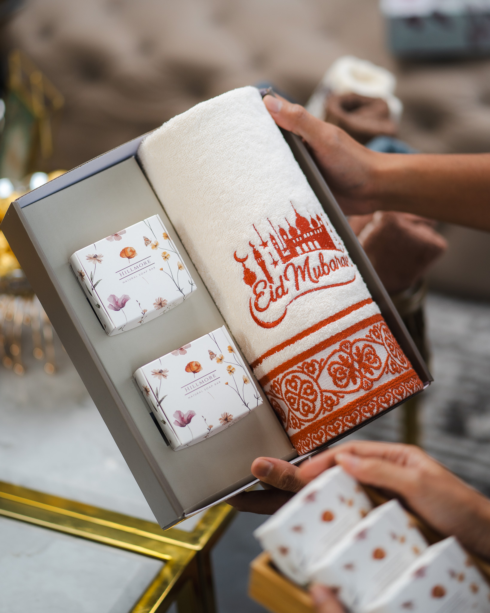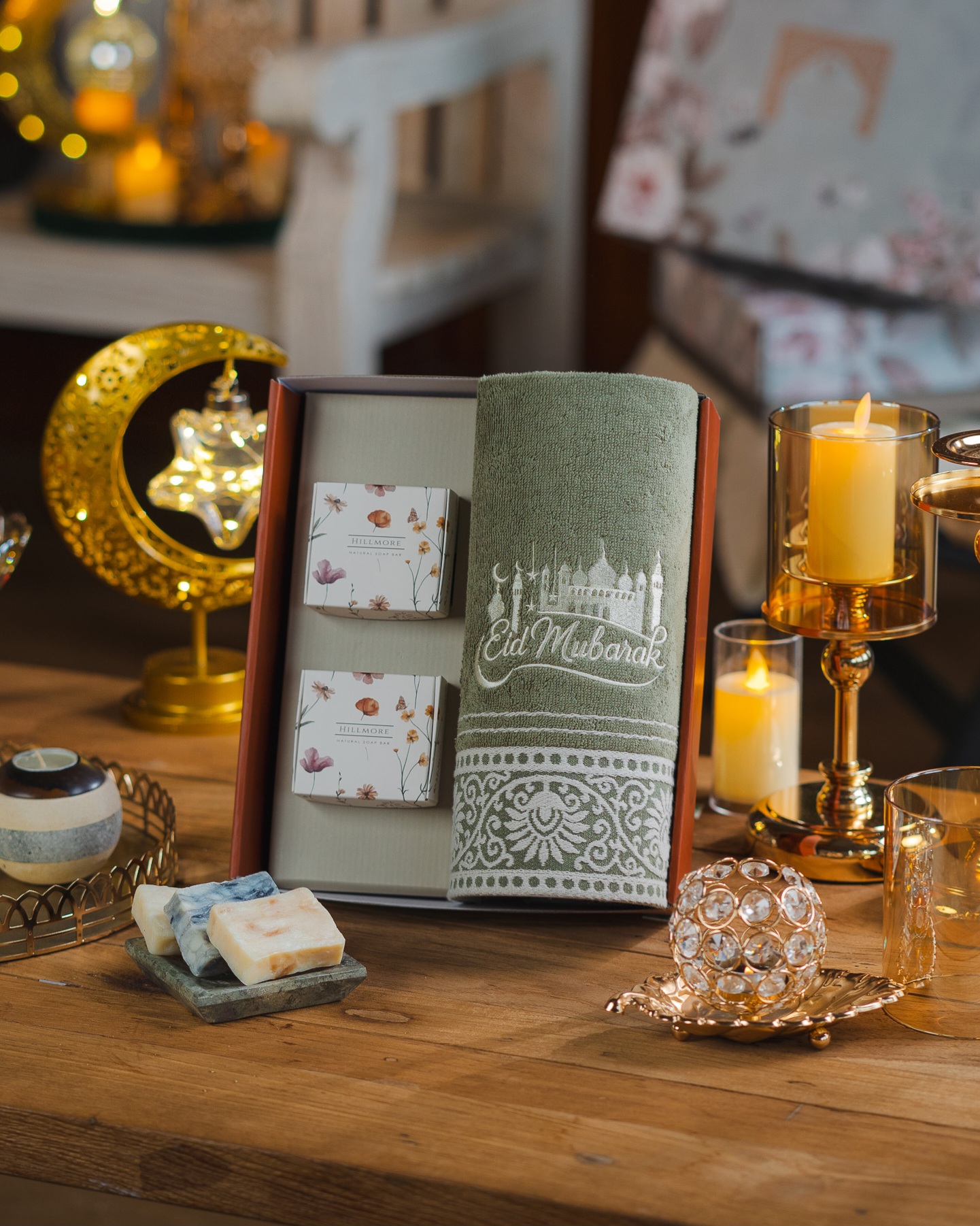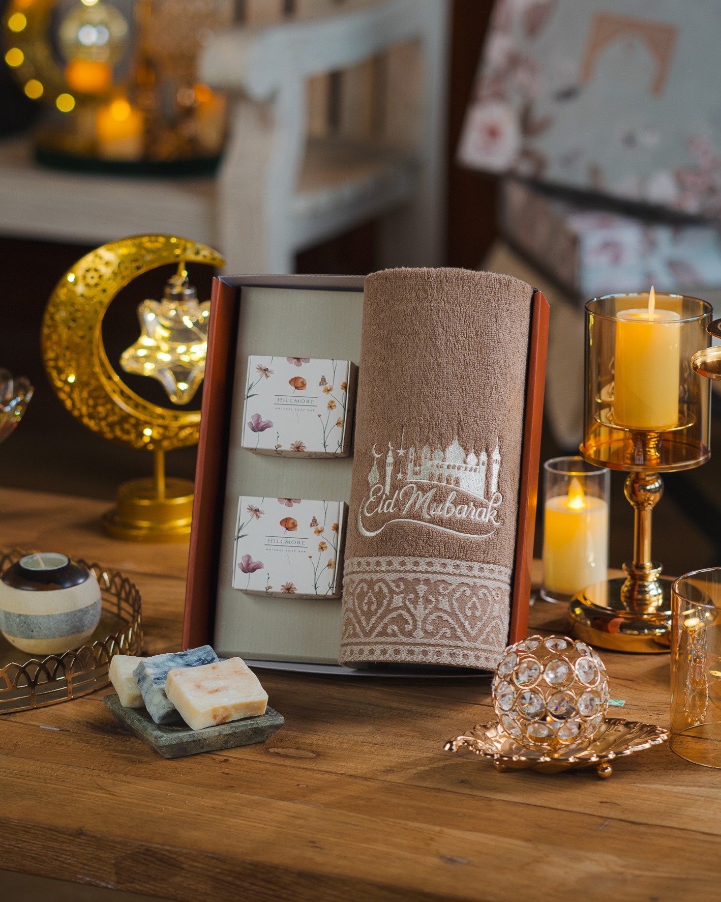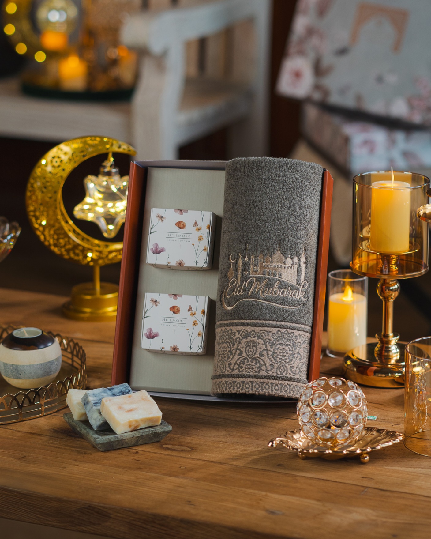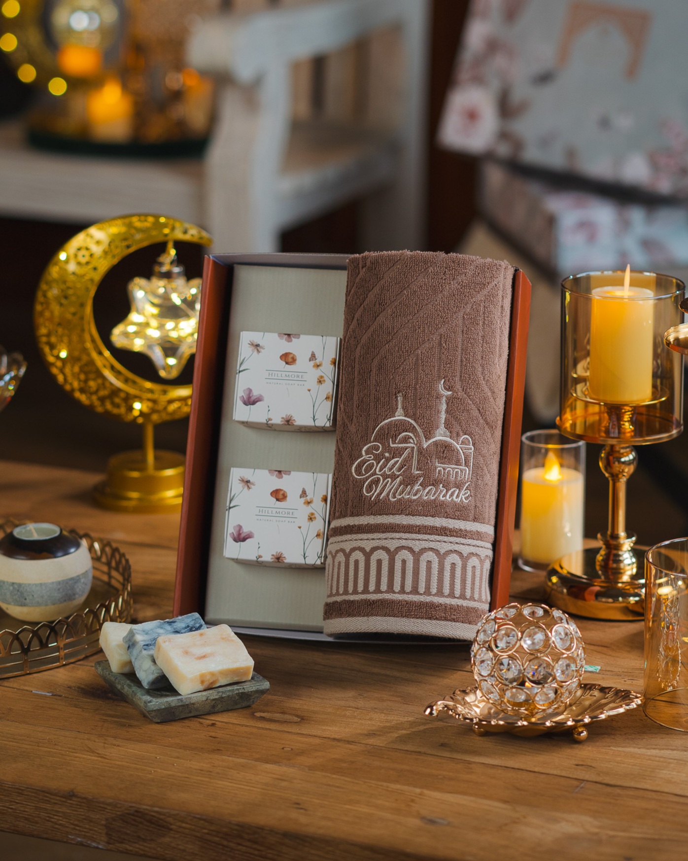 Featuring a premium sport towel adorned with beautiful Eid Mubarak embroidery, paired with Hillmore Natural Soaps crafted from turmeric teatree and charcoal, each element is chosen to promote comfort, freshness, and well-being. Presented in an exclusive Eid Mubarak gift box with a matching greeting card, Scientia is an ideal choice for refined personal gifting and practical corporate gestures.