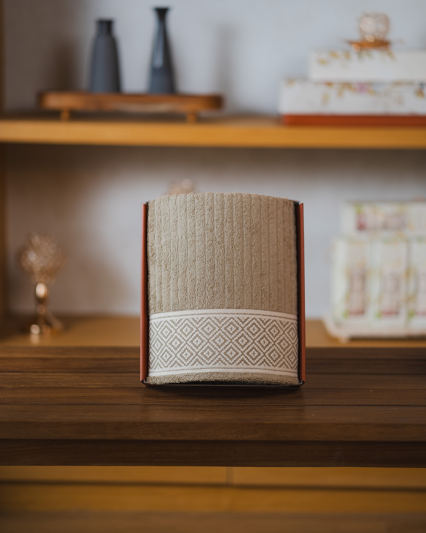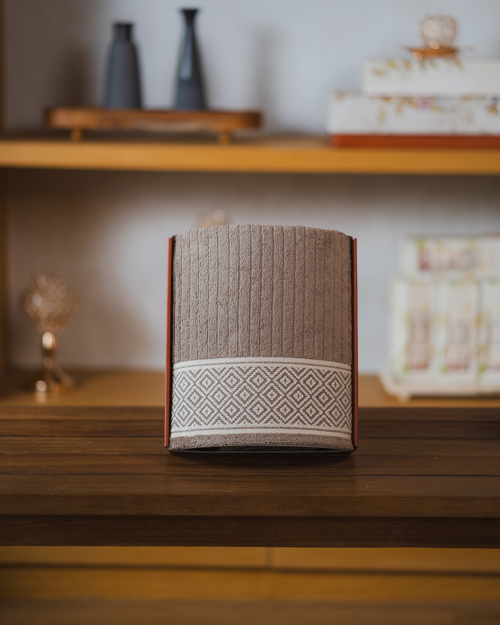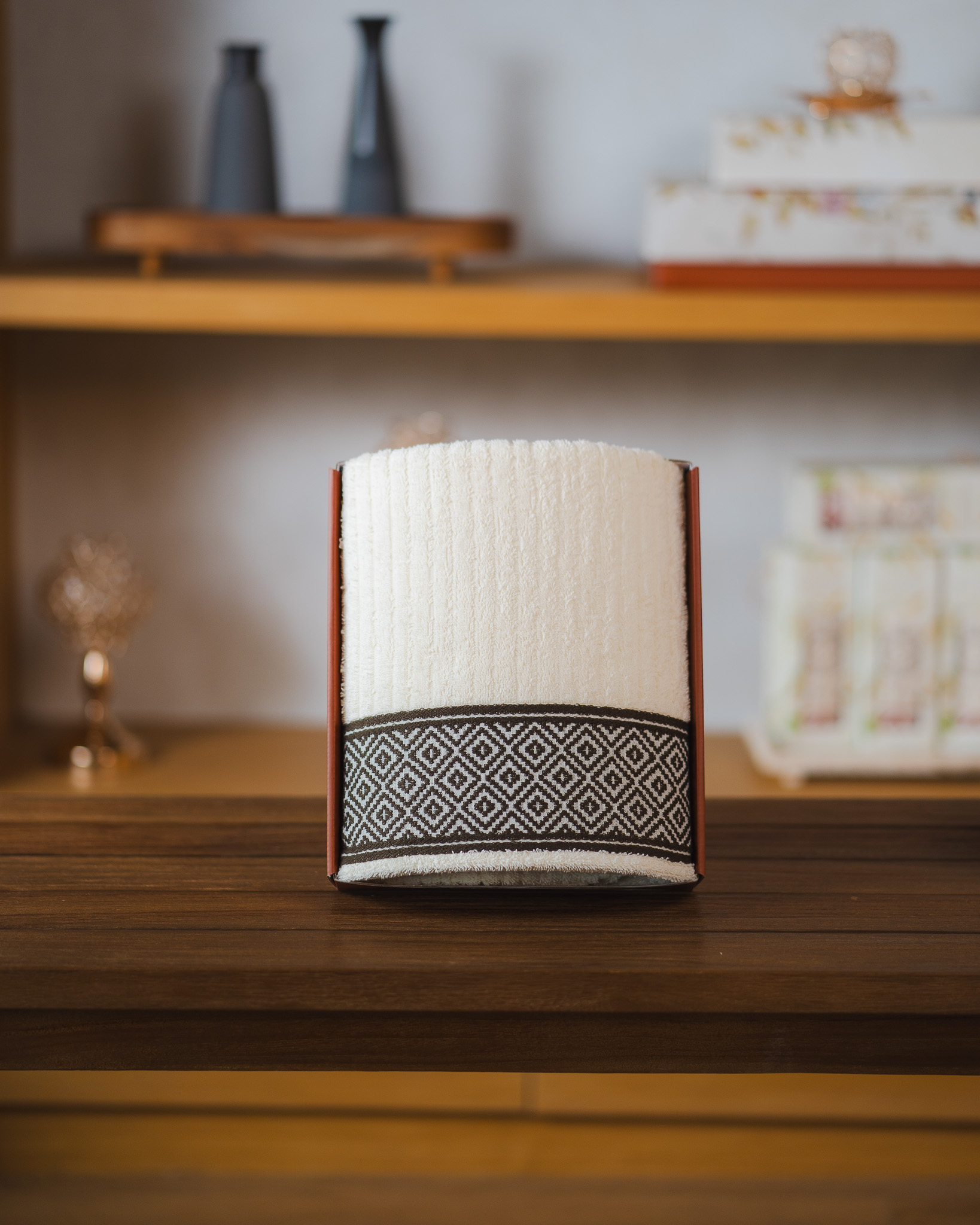 Detail motif border geometrik khas Elora menambah karakter elegan yang timeless, sementara pilihan warna-warna natural seperti Cream, Grey, dan Sand memberikan nuansa hangat dan timeless yang mudah dipadukan. Dikemas dalam gift box eksklusif Hillmore, Single Gift Elora siap menjadi persembahan yang penuh gaya untuk berbagai momen spesial.