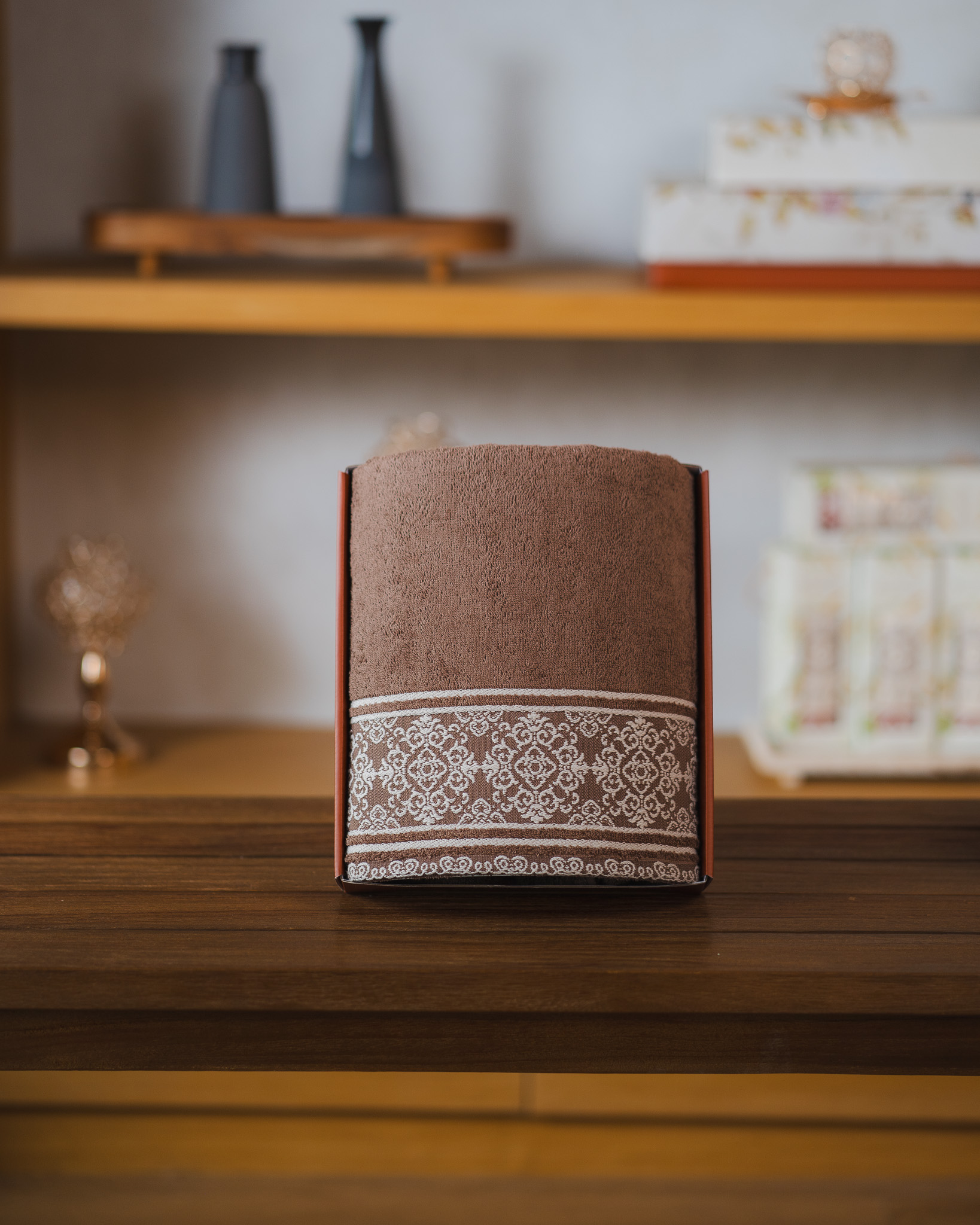 Motif woven klasik Zeya menjadi ciri khas yang menciptakan tampilan elegan dan refined, sementara pilihan warna Brown, Brick, dan Blue menghadirkan nuansa hangat dan sophisticated. Setiap helai handuk membawa kualitas premium yang cocok untuk penggunaan harian maupun sebagai hadiah berkelas.